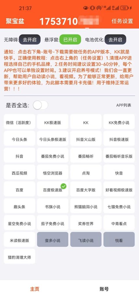 这款软件支持30个APP:快手极速、快手正式、今日头条,头条极速,七猫小说、熊猫小说、星空小说、百度大字,百度极速、抖音极速、茄子小说、快手小说、抖音正式、番茄小说、番茄音乐,番茄畅听音乐,点淘,快音,好看视频,书旗小说,中青看点,西瓜视频,悟空浏览器,等多个平台,助手执行全自动挂机刷金币,开宝箱,看广告任务,单机多平台运行一天10-20+。 目前市面上功能最全的视频挂机撸金币项目之一,工作室头牌项目,可批量放大操作。
