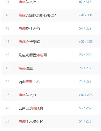 我们没必要跟人家一起卷热词,继续深挖一下,比如搜“痔疮”,往下拉一下,就能看到很多跟“痔疮”相关的长尾关键词,别看单个流量不大,但合在一起,那流量可就大了。